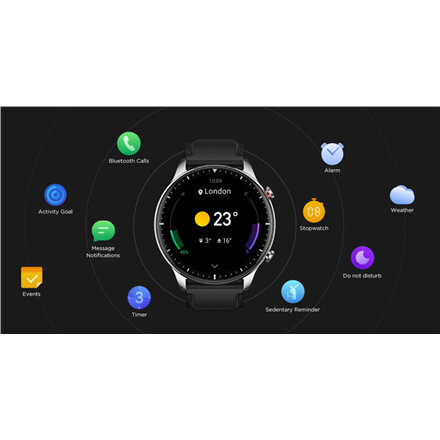 3D Curved Bezel-less design; Exquisite Craftmanship; Confident time control; Abnormal Heart rate alerts; Blood-oxygen Saturation Measurement; PAI Health Assesment system; Sleep Quality Monitoring; Stress Level Monitoring; 5 ATM Water resistance; 12 built-in Sports modes; Extended battery life; Music Storage and Playback; Bluetooth Call function; Alexa built-in; Offline Voice Assistant; Quick Access functions (swipe left-right); Customize Alert duration and intensity; Optimized Health data management