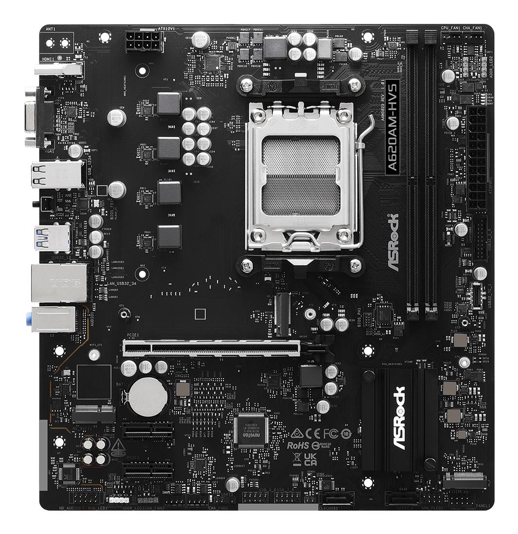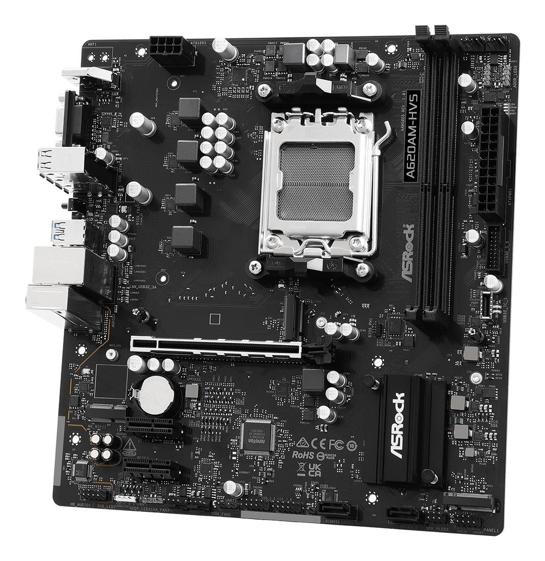 SummaryAsrock A620AM-HVS. Processor manufacturer: AMD, Processor socket: Socket AM5, Compatible processor series: AMD Ryzen 7000 Series, AMD Ryzen 8000 Series, AMD Ryzen 9000 Series. Supported memory types: DDR5-SDRAM, Maximum internal memory: 128 GB, Memory slots type: DIMM. Supported storage drive interfaces: PCI Express 3.0, PCI Express 4.0, SATA III, Supported storage drive types: HDD & SSD, RAID levels: 0, 1, 10. Maximum resolution: 3840 x 2160 pixels. USB connector type: USB Type-A