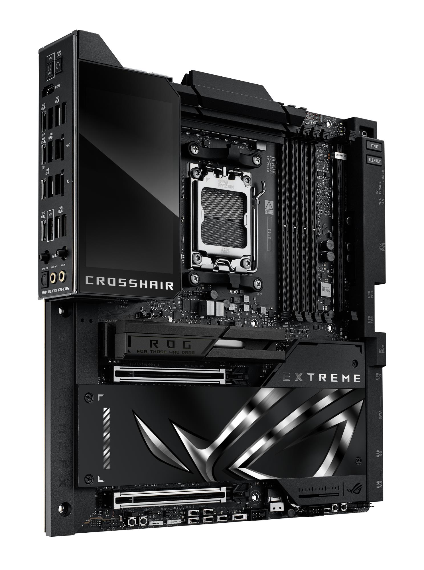Summary ASUS ROG CROSSHAIR X870E EXTREME. Processor manufacturer: AMD, Processor socket: Socket AM5, Compatible processor series: AMD Ryzen 7000 Series, AMD Ryzen 8000 Series, AMD Ryzen 9000 Series. Supported memory types: DDR5-SDRAM, Maximum internal memory: 256 GB, Memory slots type: DIMM. Supported storage drive interfaces: M.2, SATA III, SlimSAS, Supported storage drive types: HDD & SSD, RAID levels: 0, 1, 5, 10. Ethernet interface type: 5 Gigabit Ethernet, 10 Gigabit Ethernet, Top Wi-Fi standard: Wi-Fi 7 (802.11be), Wi-Fi standards: Wi-Fi 7 (802.11be). Component for: PC, Motherboard form factor: Extended ATX, Motherboard chipset family: AMD