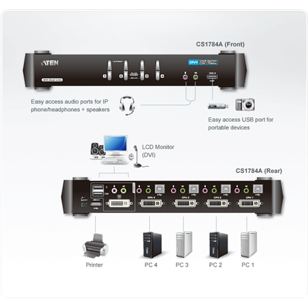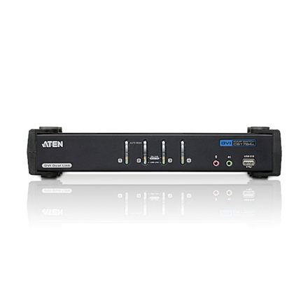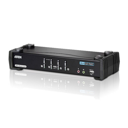 | Kitos savybės | Superior video quality: 1920 x 1200 @ 60Hz (Single Link); 2560 x 1600 @ 60Hz (Dual Link); nVidia 3D vision ready. Computer selection via font panel pushbuttons, hotkeys, and mouse; DVI digital and analog monitor support – fully compliant with the DVI specifications. Video DynaSync™ – Exclusive ATEN technology that eliminates boot-up display problems and optimizes resolution when switching between ports. Multiplatform support – Windows, Linux, Mac, and Sun. "Console Ports-1 x DVI-I Female (White),2 x USB Type A Female (rear panel), 2 x 3.5mm Audio Jack Female (Green; 1 x front panel, 1 x rear panel) , 2 x 3.5mm Audio Jack Female (Pink; 1 x front panel, 1 x rear panel). KVM Ports- 4 x DVI-I Female (White),4 x USB Type B Female, 4 x 3.5mm Audio Jack Female (Green), 4 x 3.5mm Audio Jack Female (Pink). Power- 1 x DC Jack. USB Hub-2 x USB Type A Female (1 x front panel, 1 x rear panel). |