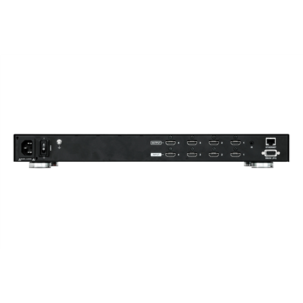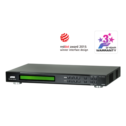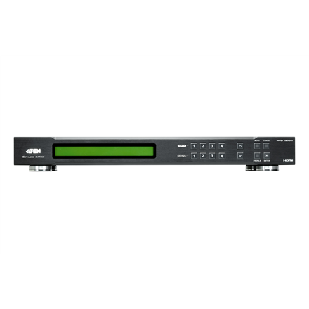| Kitos savybės | Connects any of 4 HDMI sources to any of 4 HDMI displays. Seamless Switch™ – ATEN FPGA design unifies video formats to provide continuous video streams, real-time switching and stable signal transmissions. HDMI (3D, Deep color); HDCP 1.4 compatible. Multiple Control Methods – system management via front-panel pushbuttons, IR, RS-232 and Ethernet (Telnet / Web GUI) connections. |