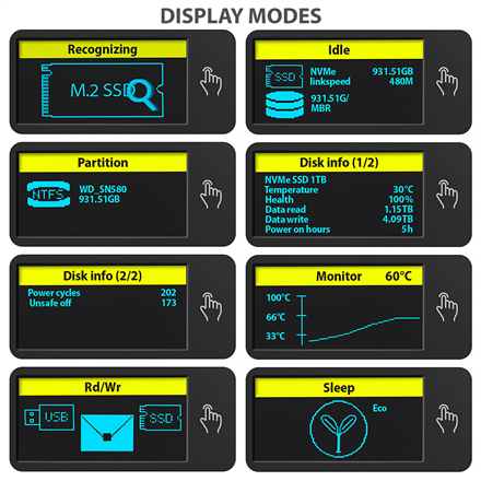 | Gamintojo prekės serija | External USB-C 10Gbps metal box with info display for M.2 NVMe and SATA SSD |