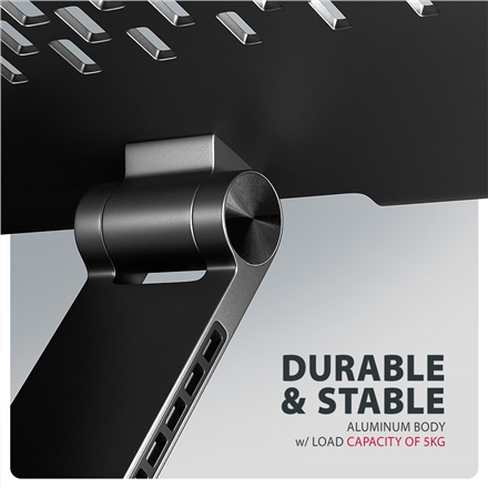 | Kitos savybės | Lightweight and strong metal construction; Anti-slip finish, which also protects the device from scratches; Swivel arm mechanism (360° around its axis); Many adjustable positions; Laptop surface tilt adjustment (0–180°); Arm tilt adjustment (0–180°) |