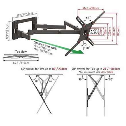 | VESA tvirtinimo sistemos | 75 x 75, 100 x 100, 100 x 200, 200 x 100, 200 x 200, 300 x 300, 300 x 400, 400 x 200, 400 x 300, 400 x 400, 600 x 400 mm |