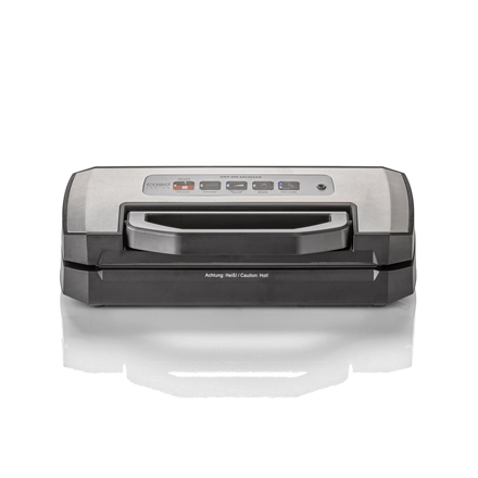 | Kitos savybės | Versatile functions: - Automatic vacuuming and welding; - Manual welding; - Manually adjustable, infinitely variable vacuum strength: ideal for sensitive food; - Vacuum tank function; - Adjustable sealing time for dry and moist food. Practical locking handle for convenient one-hand operation. Durable vacuum pump with up to 12 litres/min and a maximum vacuum of -0.8 bar. High-quality design stainless steel front. Removable vacuum chamber for easy cleaning. Electronic temperature monitoring. |