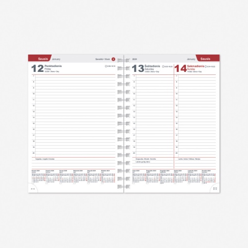 Minkštos dirbtinės odos viršelis su specialiai įdedamu kalendoriumi.
