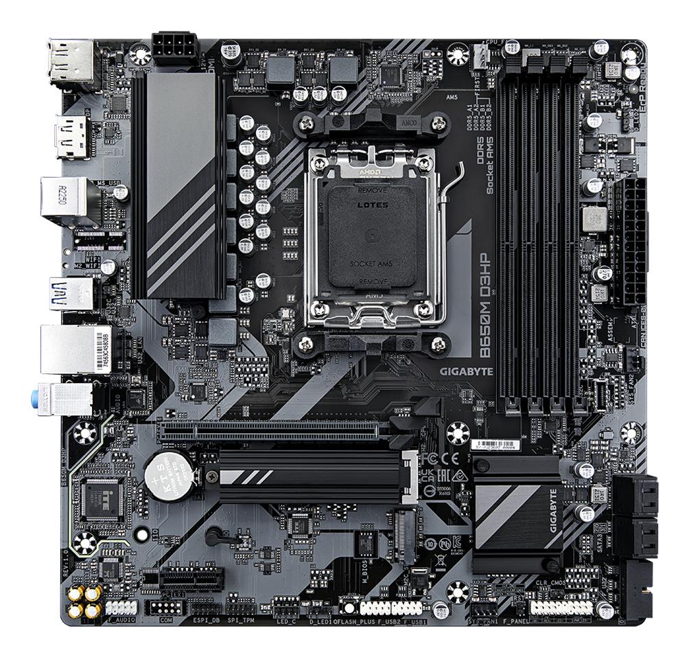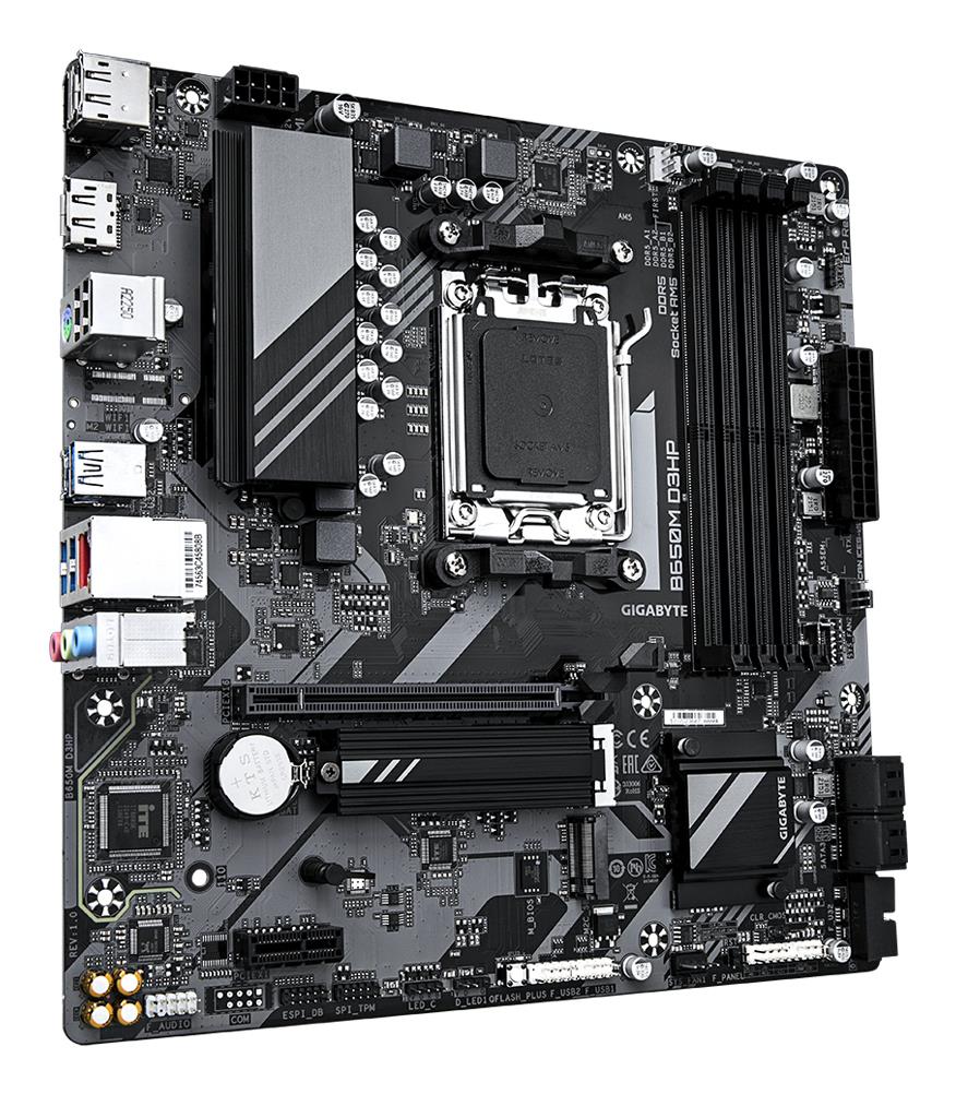 GIGABYTE B650M D3HP Motherboard - AMD Ryzen 9000 Series CPUs, 5+2+2 Phases VRM, up to 7600MHz DDR5 (OC), 2xPCIe 4.0 M.2, 2.5GbE LAN, USB 3.2 Gen 1. Processor manufacturer: AMD, Processor socket: Socket AM5, Compatible processor series: AMD Ryzen 7000 Series, AMD Ryzen 8000 Series, AMD Ryzen 9000 Series. Supported memory types: DDR5-SDRAM, Maximum internal memory: 256 GB, Memory slots type: DIMM. Supported storage drive interfaces: M.2, SATA III, Supported storage drive types: HDD & SSD, RAID levels: 0, 1, 10. Maximum resolution: 4096 x 2160 pixels. Ethernet interface type: 2.5 Gigabit Ethernet, LAN controller: Realtek RTL8125