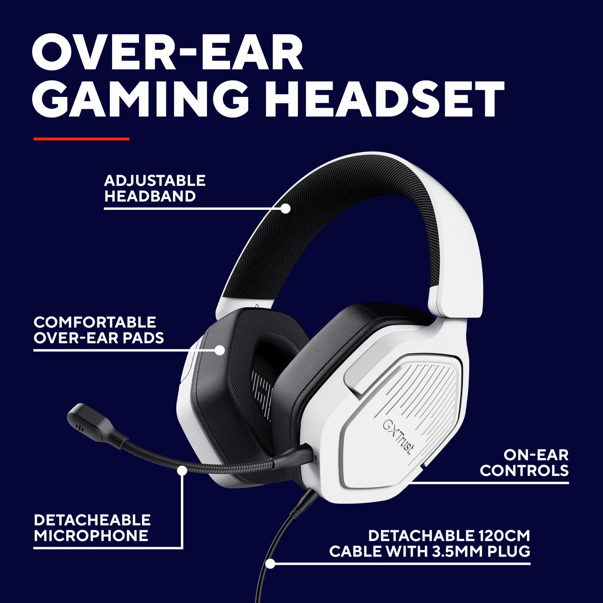 Trust GXT492W Carus. Product type: Headset. Connectivity technology: Wired. Recommended usage: Gaming. Headphone frequency: 20 - 20000 Hz. Cable length: 1.2 m. Weight: 284 g. Product colour: White