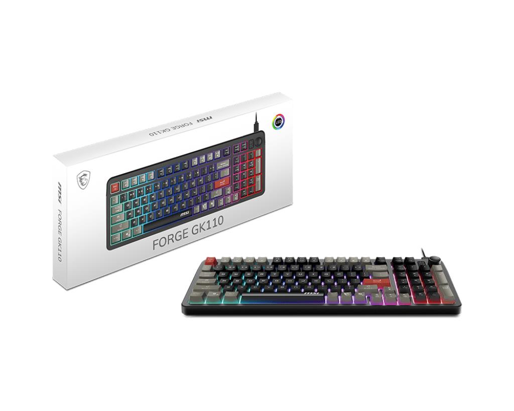 MSI FORGE GK110. Keyboard form factor: Full-size (100%), Connectivity technology: Wired, Device interface: USB, Keyboard key switch: Membrane, Keyboard layout: QWERTY, Keyboard number of keys: 97. Backlight type: RGB LED. Cable length: 1.5 m. Recommended usage: Gaming. Product colour: Black
