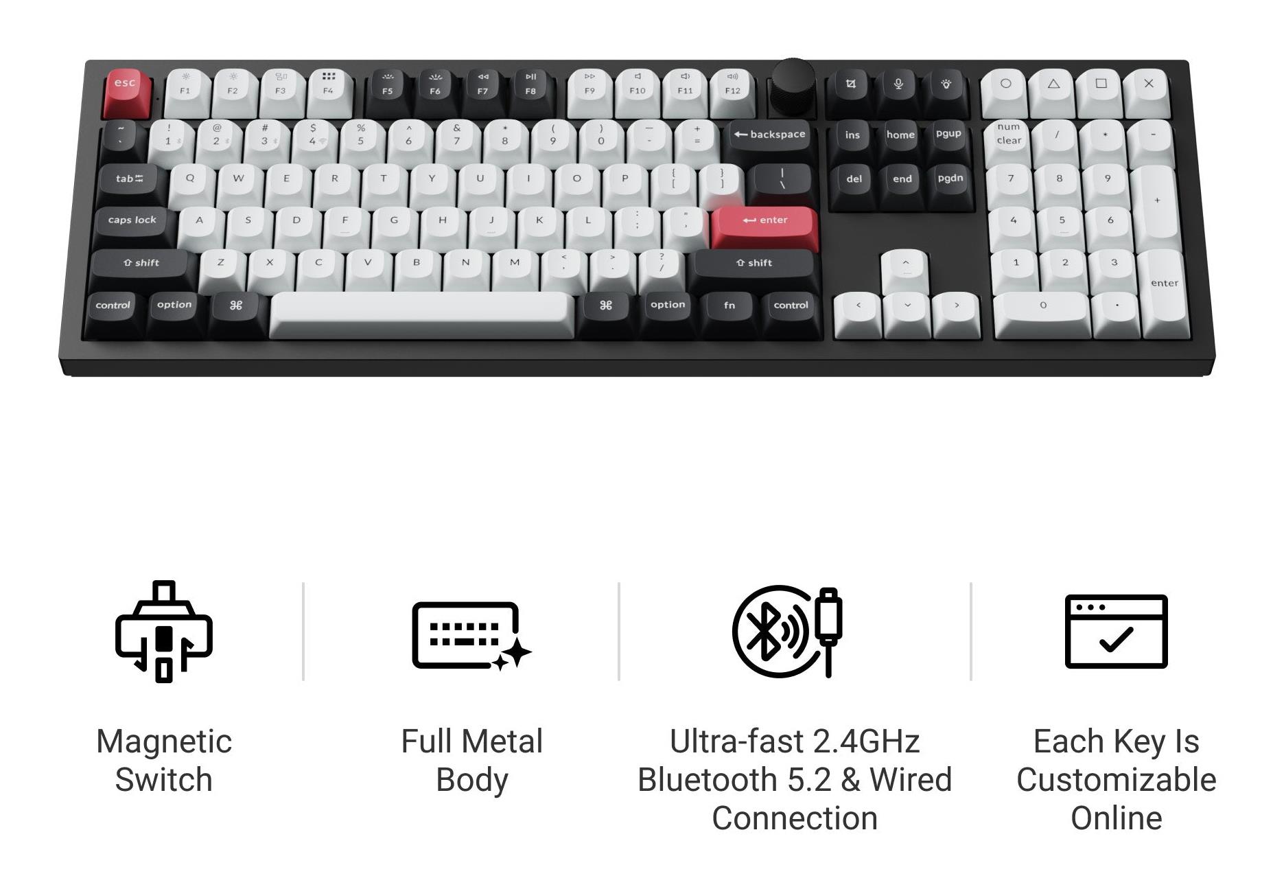 | Summary | Keychron Q6 HE QMK. Keyboard form factor: Full-size (100%), Connectivity technology: Wired & Wireless, Device interface: USB + RF Wireless + Bluetooth, Keyboard key switch: Magnetic-mechanical key switch, Keyboard layout: QWERTY. Backlight type: RGB LED. Cable length: 1.8 m. Recommended usage: Universal. Product colour: White |