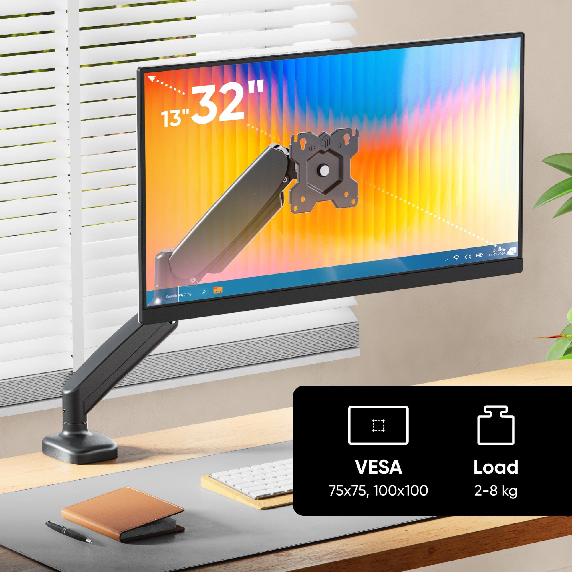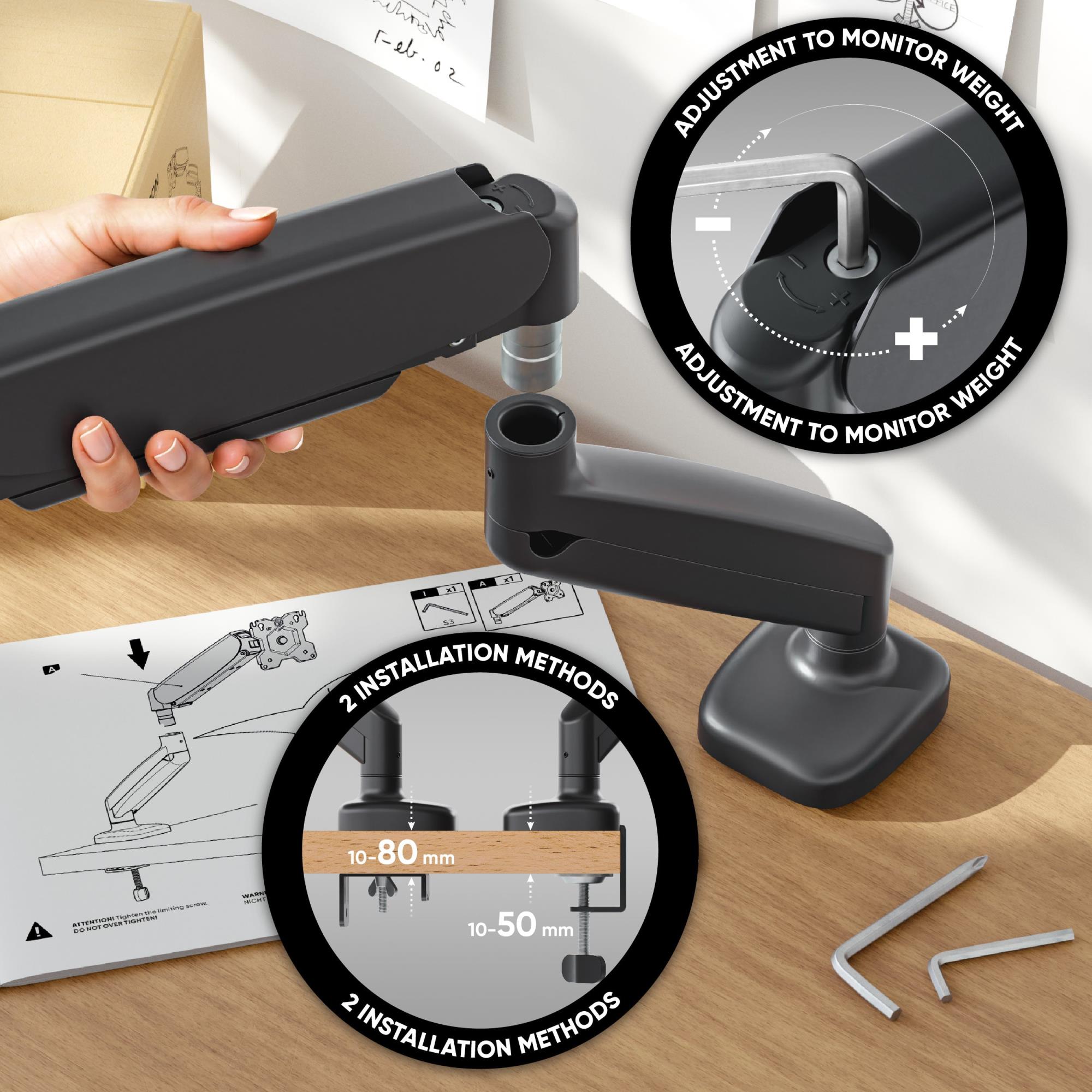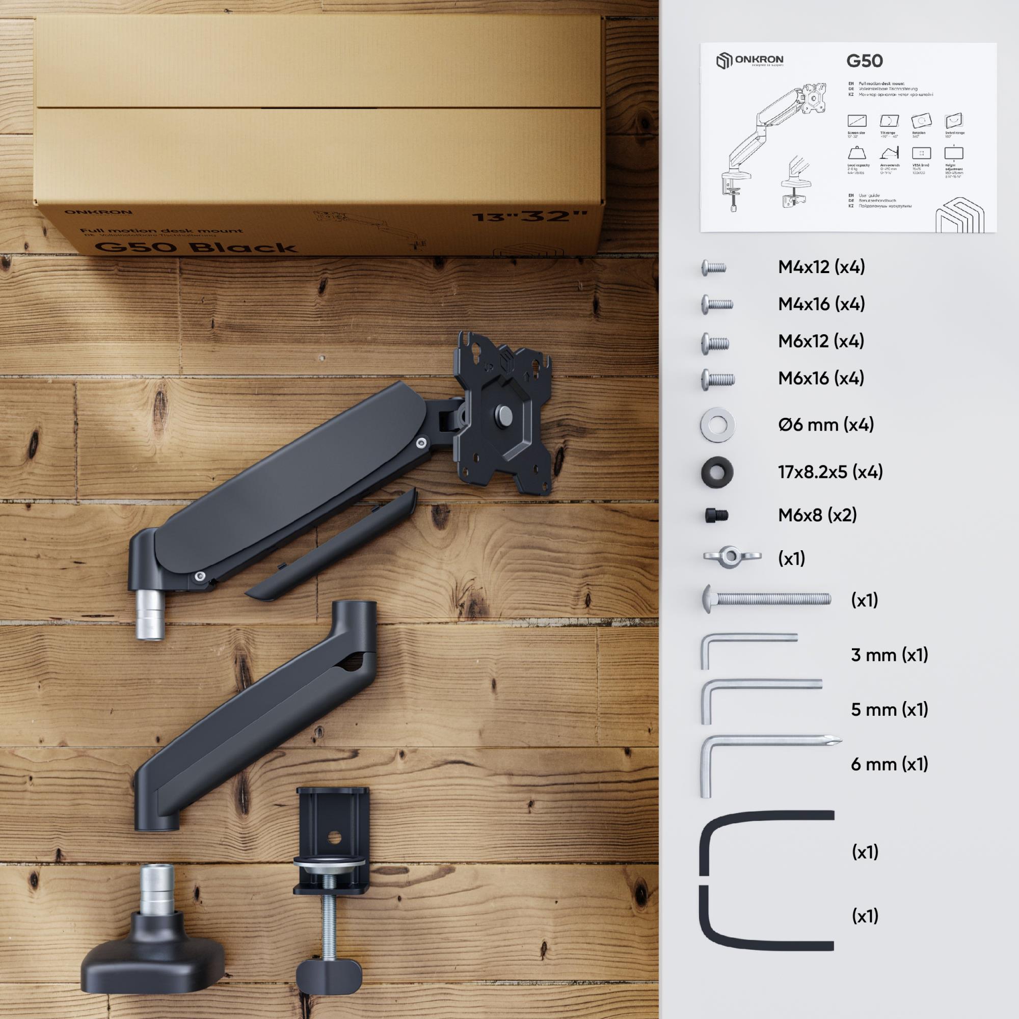 | Summary | ONKRON G50. Mounting: Clamp/Grommet, Maximum weight capacity: 8 kg, Minimum screen size: 33 cm (13"), Maximum screen size: 81.3 cm (32"), Minimum VESA mount: 75 x 75 mm, Maximum VESA mount: 100 x 100 mm. Height adjustment, Tilt angle range: -45 - 90°. Product colour: Black |