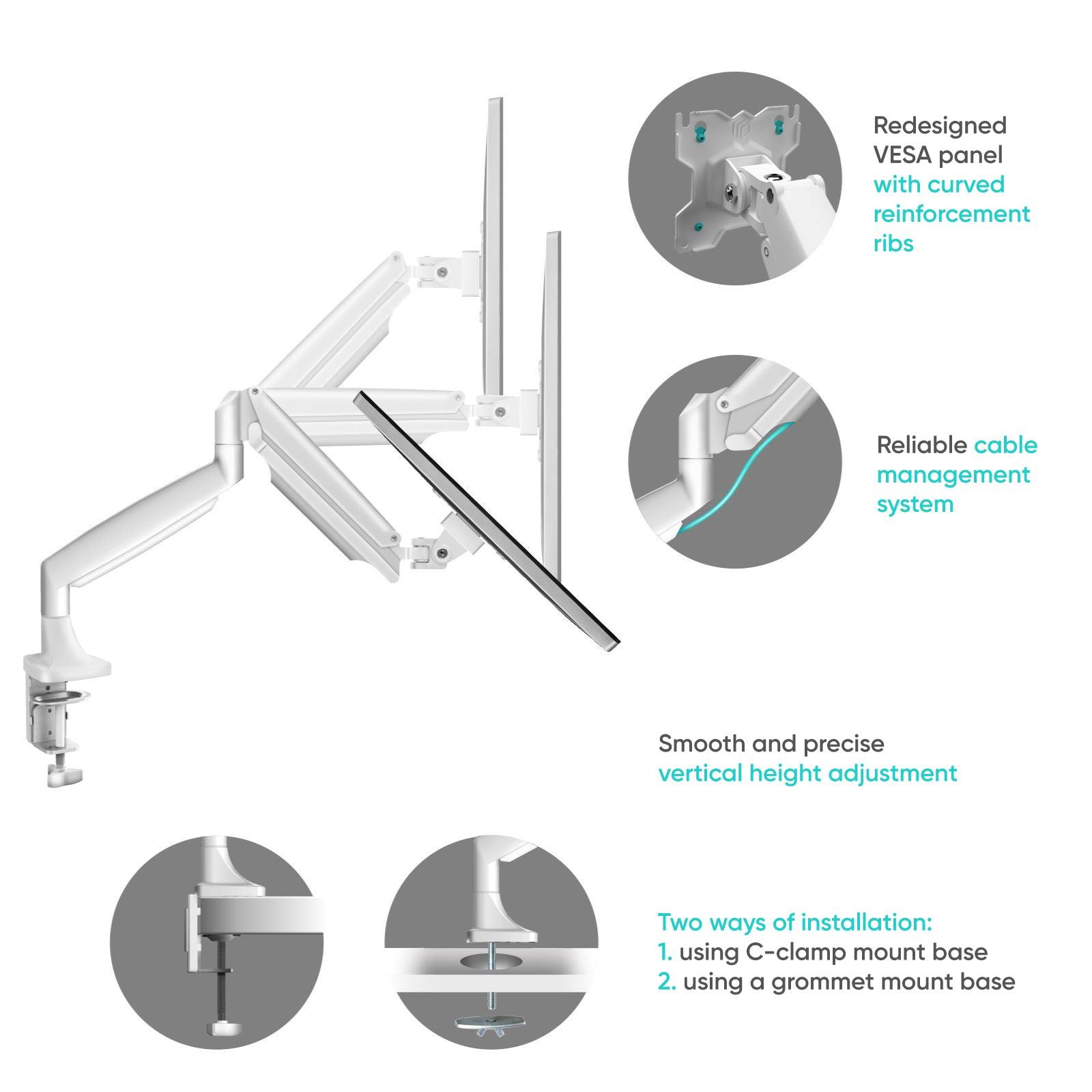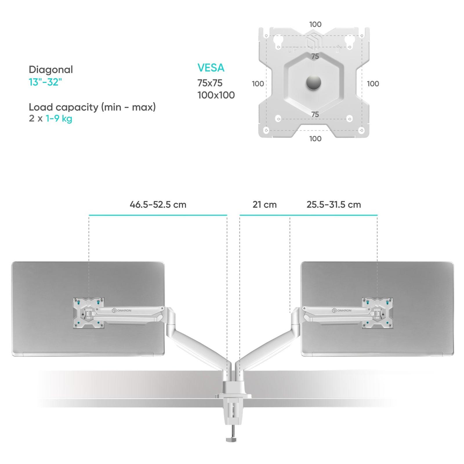 | Summary | ONKRON G200-W. Mounting: Clamp/Grommet, Maximum weight capacity: 18 kg, Minimum screen size: 33 cm (13"), Maximum screen size: 81.3 cm (32"), Minimum VESA mount: 75 x 75 mm, Maximum VESA mount: 100 x 100 mm. Height adjustment, Tilt angle range: -90 - 45°. Product colour: White |