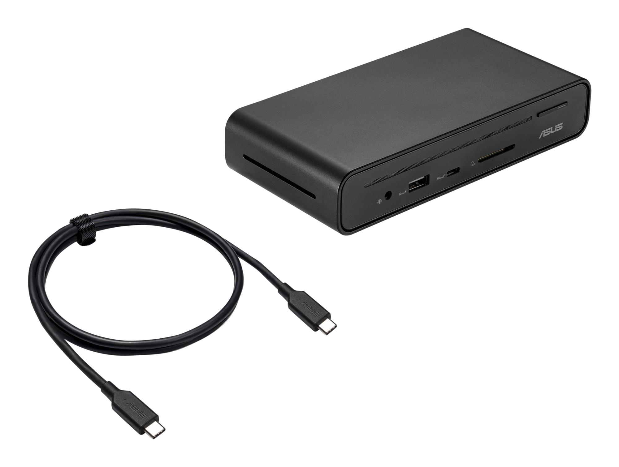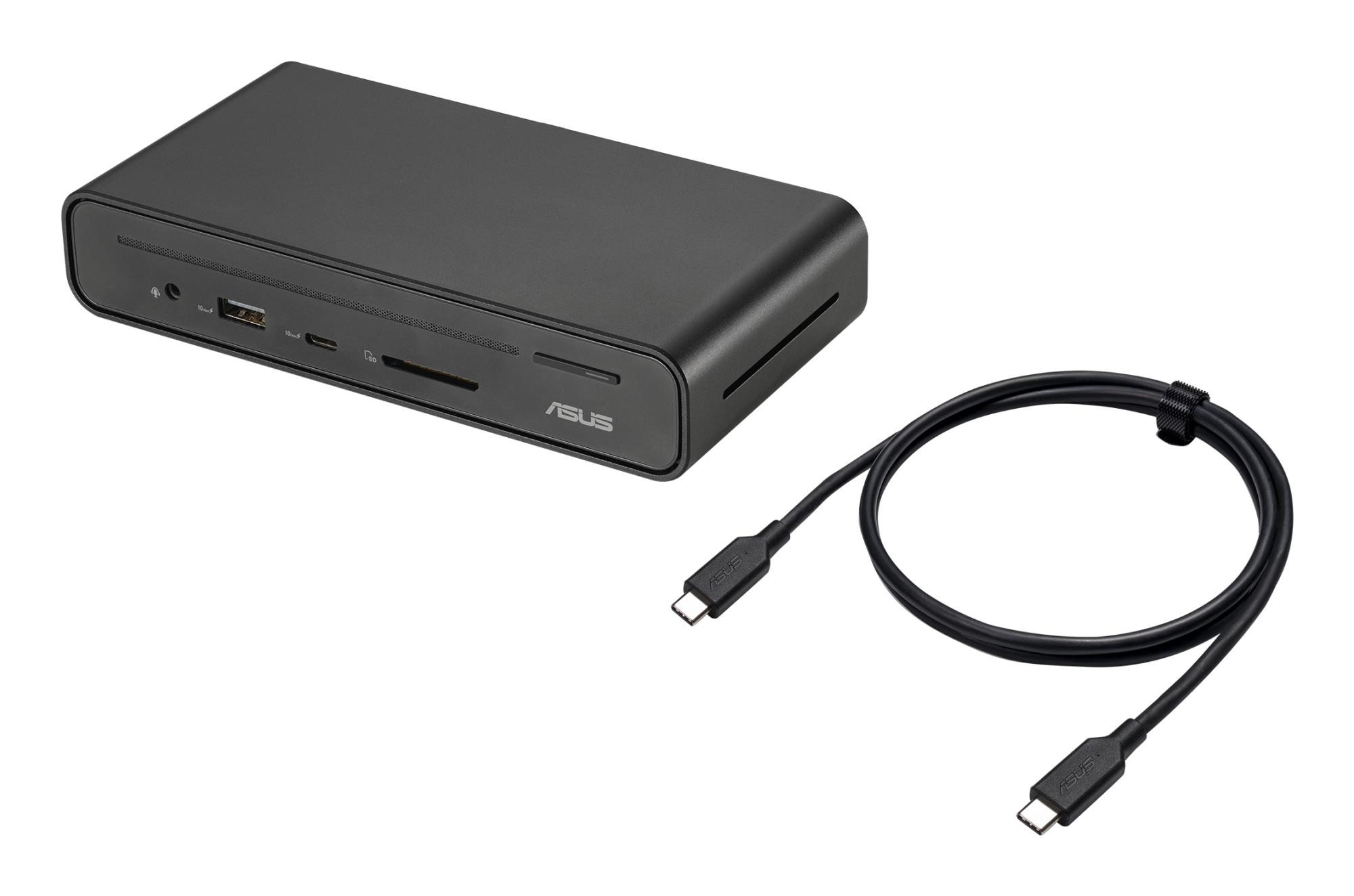 ASUS Triple Display USB-C Dock Duo DC301. Connectivity technology: Wired, USB Power Delivery up to: 90 W. Ethernet LAN data rates: 1000 Mbit/s. Product colour: Black, Compatible memory cards: SD, Data transfer rate: 10 Gbit/s. Power source type: DC, Input current: 7.5 A, Power supply: 150 W. Width: 160 mm, Depth: 80 mm, Height: 32 mm