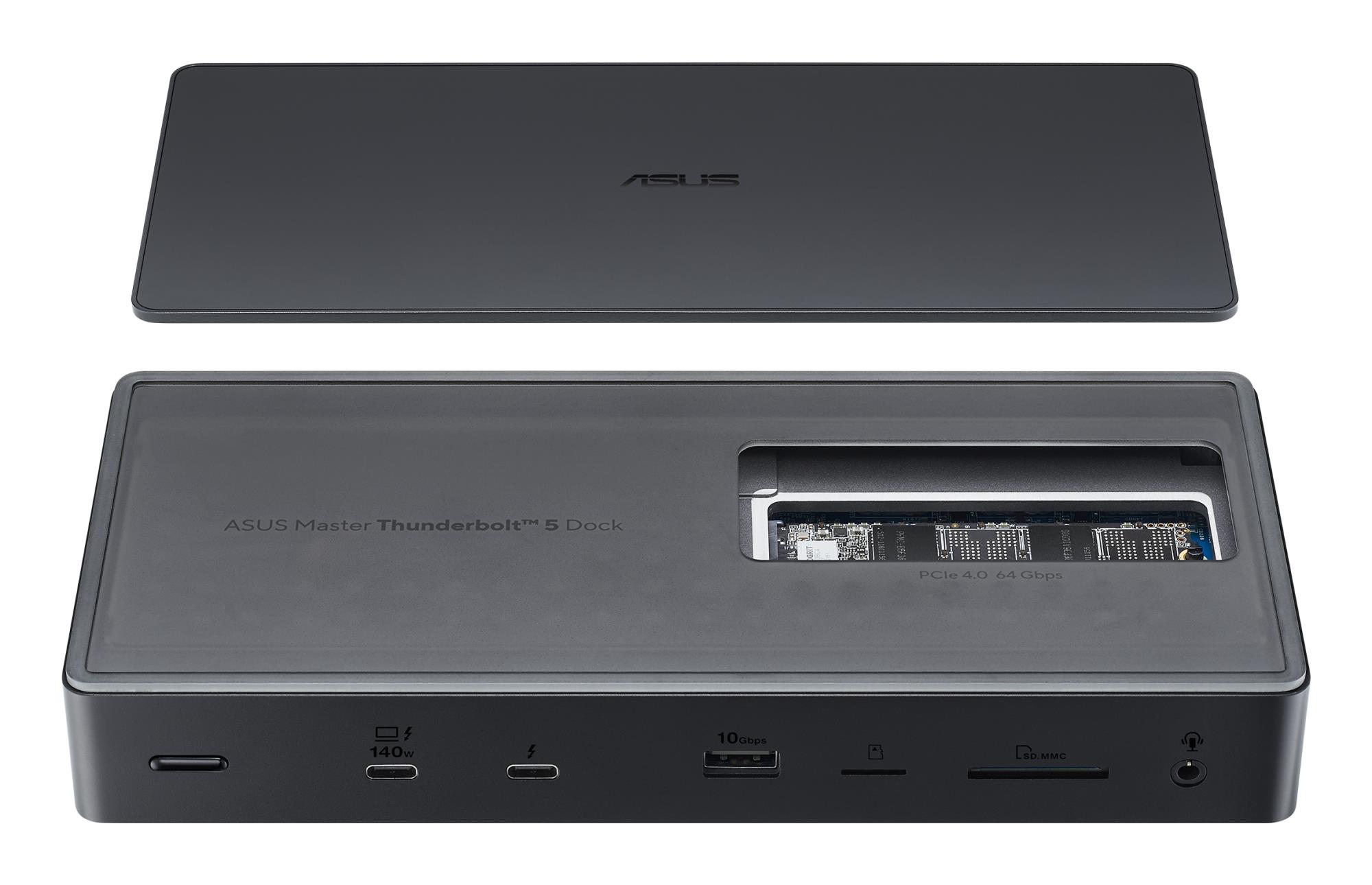 ASUS Master Thunderbolt 5 Dock DC510. Connectivity technology: Wired, Host interface: Thunderbolt 5, USB Power Delivery up to: 140 W. Ethernet LAN data rates: 2500 Mbit/s. Product colour: Black, Compatible memory cards: MicroSD (TransFlash), SD, Supported storage drive types: SSD. Power source type: DC, Input current: 9 A, Power cable length: 1 m. Width: 220 mm, Depth: 96.7 mm, Height: 38.1 mm