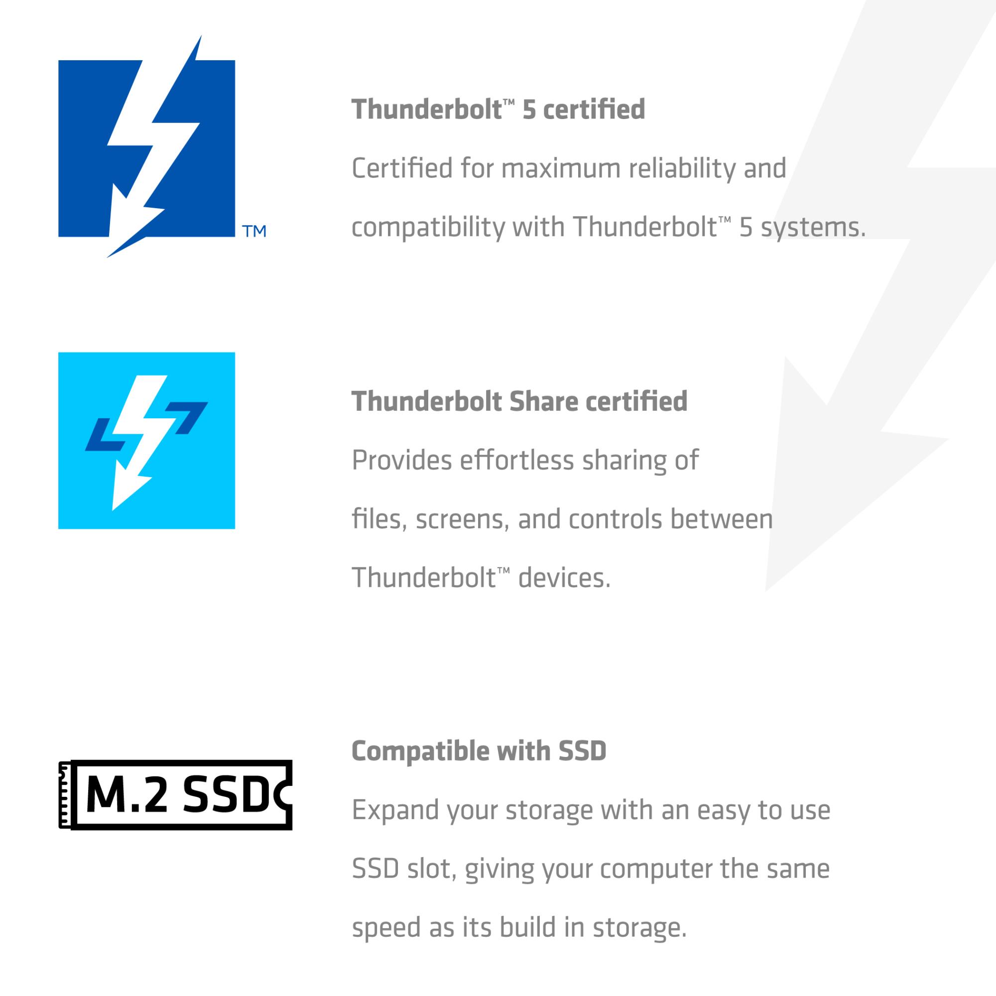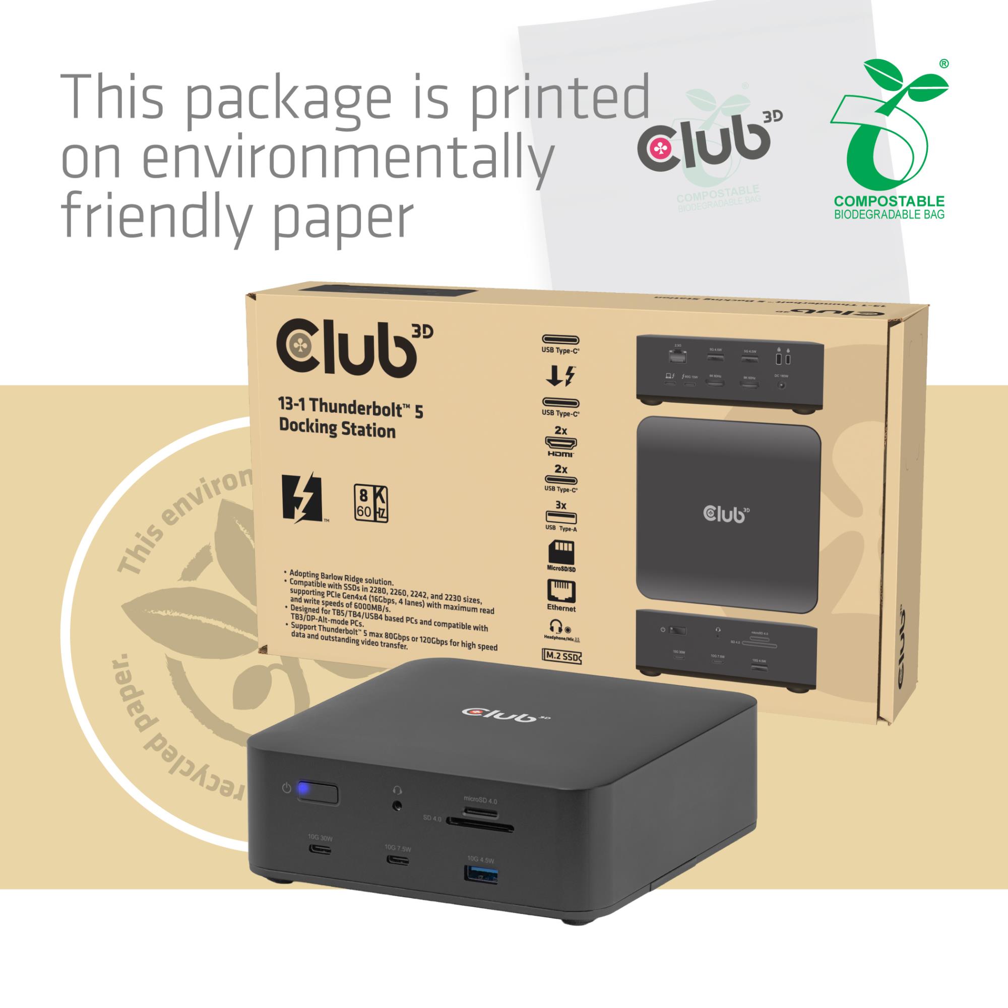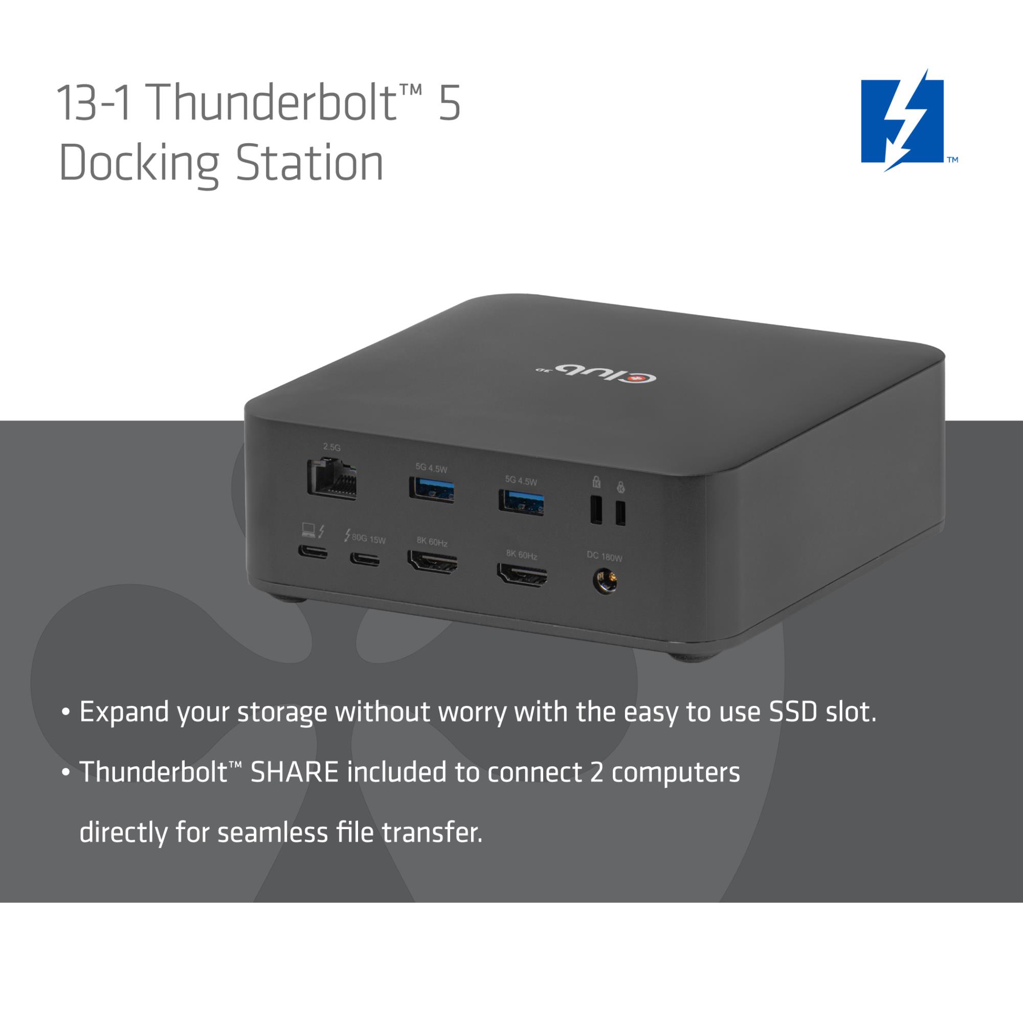 CLUB3D CSV-2562 13-1 Thunderbolt™ 5 Docking Station M.2 SSD 2x HDMI™ 8K60Hz Thunderbolt™ Share Certified 180W. Connectivity technology: Wired, Host interface: Thunderbolt 5, USB Power Delivery up to: 140 W. Ethernet LAN data rates: 10,100,1000,2500 Mbit/s. Product colour: Black, Compatible memory cards: MicroSD Express, SD, Data transfer rate: 120 Gbit/s. Power source type: DC, Power supply: 180 W, USB cable length: 1 m. Sustainability certificates: SCS Product Category Rule (PCR)