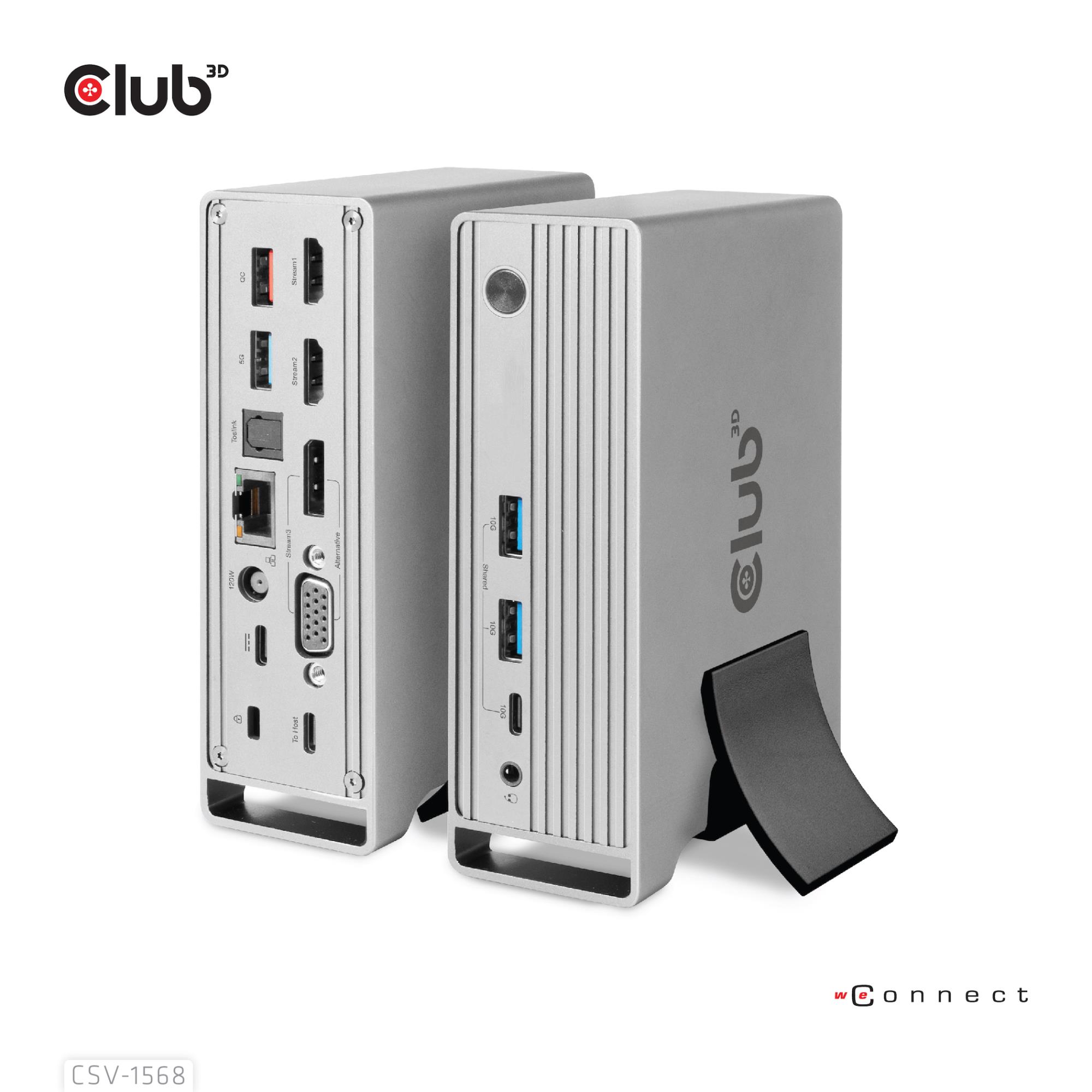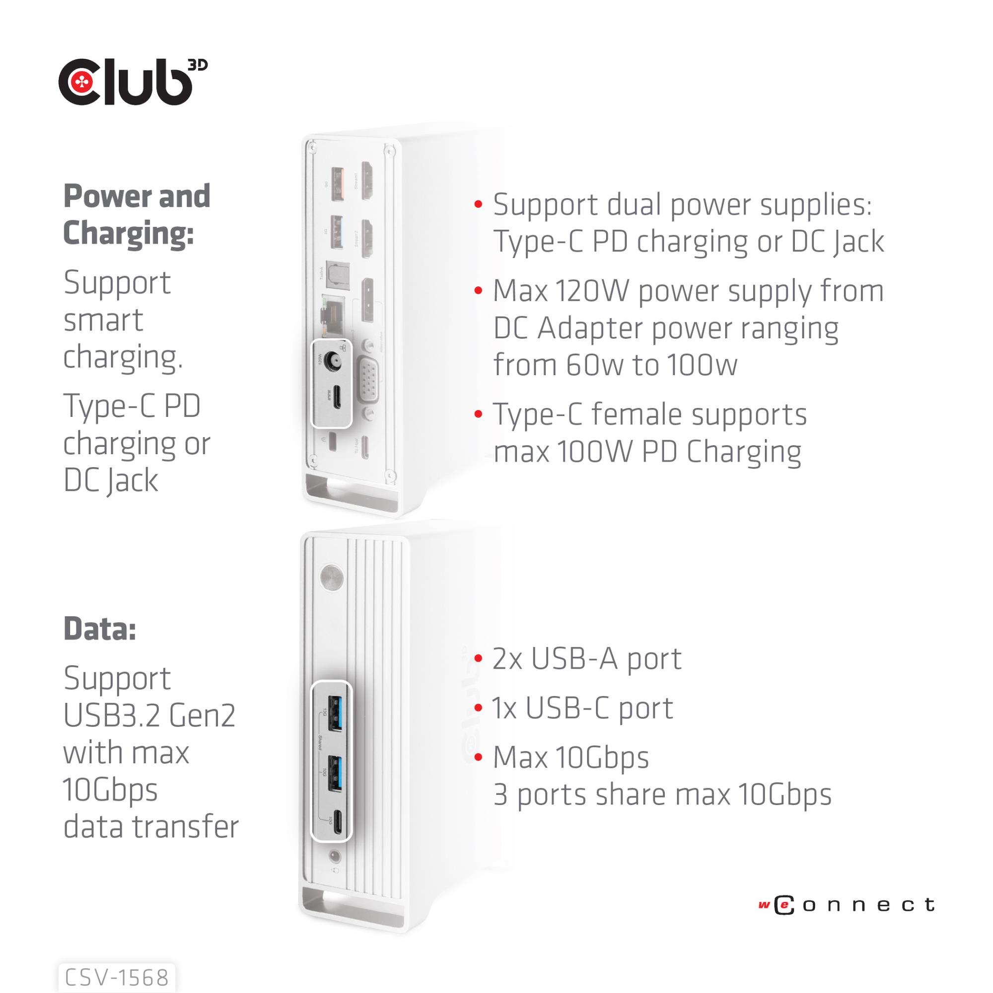 CLUB3D Docking station(Metal casing)1x USB Gen2 Type-C Female (data) 2x USB Gen2 Type-A Female 1x USB Gen1 Type-A Female 1x USB Type-A (RED) Smart Charging port 5V/2.4A Max. • 2x HDMI™ (DP Alt Mode) 1x DP™ (DP Alt Mode) hdr 1x VGA 1x RJ45 1 + 120 Watt. Connectivity technology: Docking, Host interface: USB 3.2 Gen 2 (3.1 Gen 2) Type-C, USB Power Delivery up to: 100 W. Product colour: Metallic, Data transfer rate: 16.2 Gbit/s, Maximum refresh rate: 60 Hz. Power source type: DC, Power connector: USB Type-C, AC input voltage: 100 - 240 V. Width: 139 mm, Depth: 90 mm, Height: 44 mm. Quantity per pack: 1 pc(s), Package width: 225 mm, Package depth: 155 mm