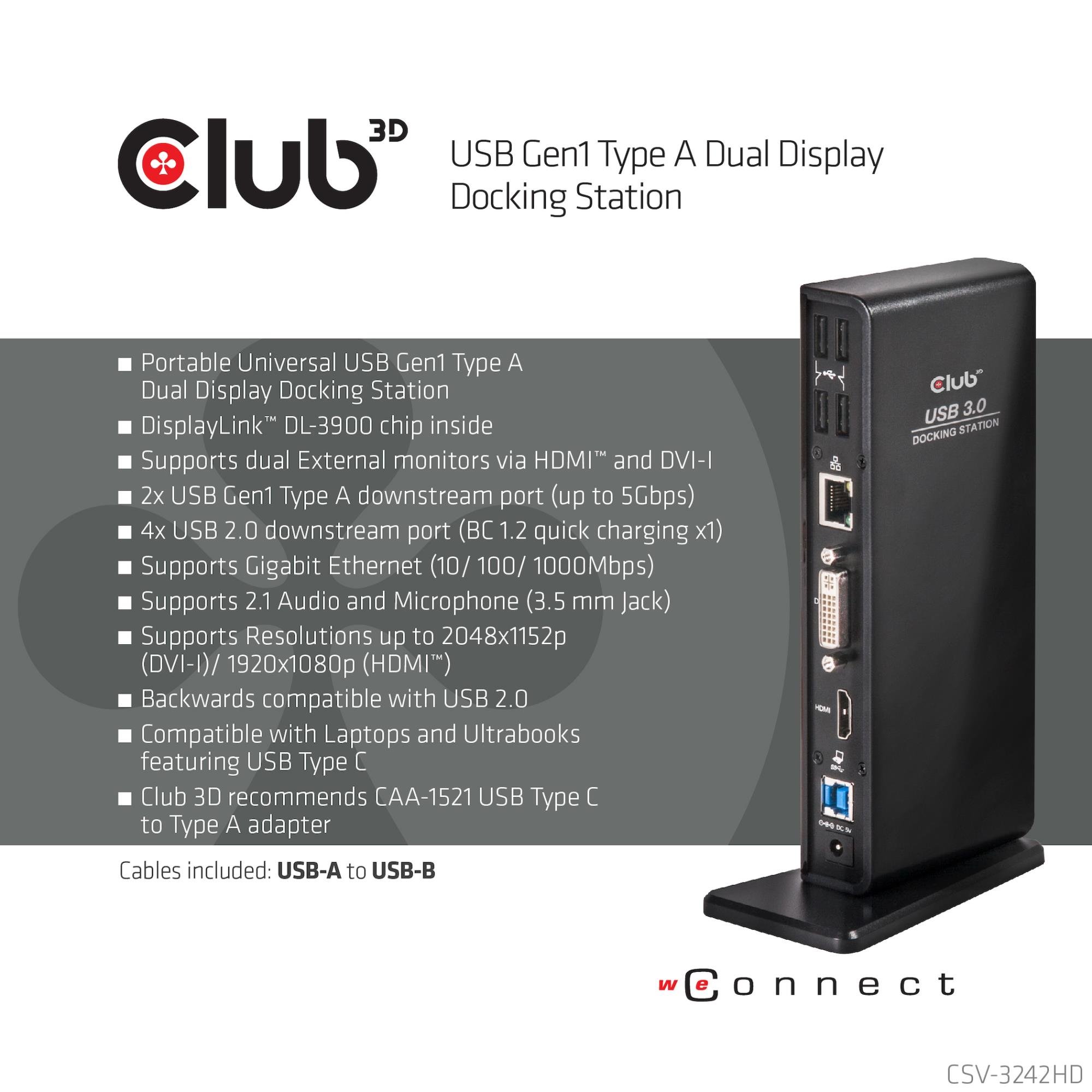 CLUB3D USB Gen1 Type A Dual Display ( HDMI and DVI) DisplayLink™ Docking Station. Connectivity technology: Wired, Host interface: USB 3.2 Gen 1 (3.1 Gen 1) Type-A, HDMI version: 1.4a. Ethernet LAN data rates: 10,100,1000 Mbit/s. Product colour: Black, LED indicators: Activity, Operation, Compatibility: Lenovo Dell Acer Asus. MSI. Toshiba Apple HP Razer. Power source type: AC. Windows operating systems supported: Windows 10, Windows 10 Education, Windows 10 Education x64, Windows 10 Enterprise, Windows 10...