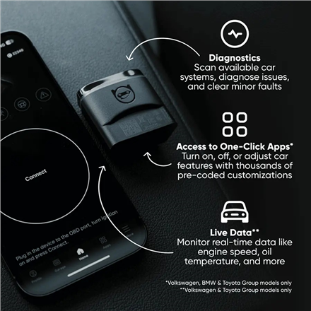 | Kitos savybės | Features for Volkswagen Group (VAG): Perform Advanced Diagnostics – scan, read, clear, and share trouble codes. Customize your car’s comfort features and reset service reminders with One-Click Apps (pre-made car customizations). View and test Live Data from your control units in real-time, like engine speed, coolant temperature, oil temperature, etc.;Features for BMW Group: Perform Advanced Diagnostics – scan all available control units, read, clear, and share trouble codes for E (from 2008), F, G, I-series, MINI (F-series), and select Rolls-Royce models. Customize your car’s comfort features and reset service reminders with One-Click Apps (pre-made car coding applications) for E, F, G, I-series, MINI (F-series), and select Rolls-Royce models.; Features for Toyota Group: Perform Advanced Diagnostics – scan, read, and clear trouble codes for our supported models. Customize your car’s comfort features and reset service reminders with One-Click Apps (pre-made car customizations). View detailed car info. Track car history.; Features for all other car brands (with CAN-bus protocol, from 2008): Run Basic OBD2 Diagnostics and read fault codes stored in a vehicle’s engine control unit and identify problems. Clea fault codes from the vehicle engine control unit once the problem has been resolved. |