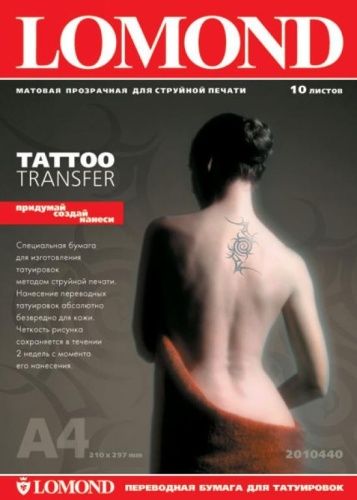 Tatoo transfer medziaga, skirta sukurti laikinas tatuiruotes. Atspausdinti ant specialios plėvelės paveikslėliai lengvai perkeliami ant nagų, odos ir t.t., bei lengvai nusiplauna šiltu vandeniu su muilu. Patartina nusiplauti tatuiruotę po 2-ų dienų. PATIKRINTA DERMATOLOGŲ! Tinka nejautriai odai. Puikus spalvų atvaizdavimas. Rekomenduojama skiriamoji geba: 720dpi. Greitai džiūva. Storis: 220mkm. Tinka spausdinti visų rūšių spalvotais rašaliniais spausdintuvais.