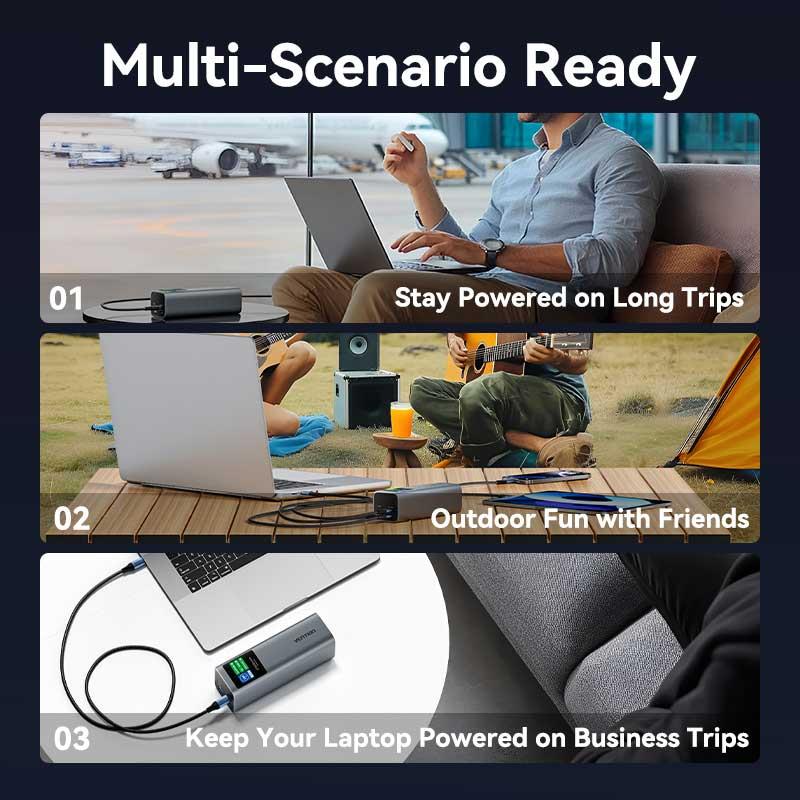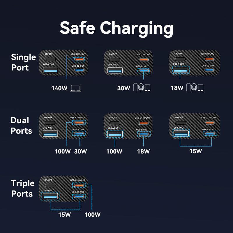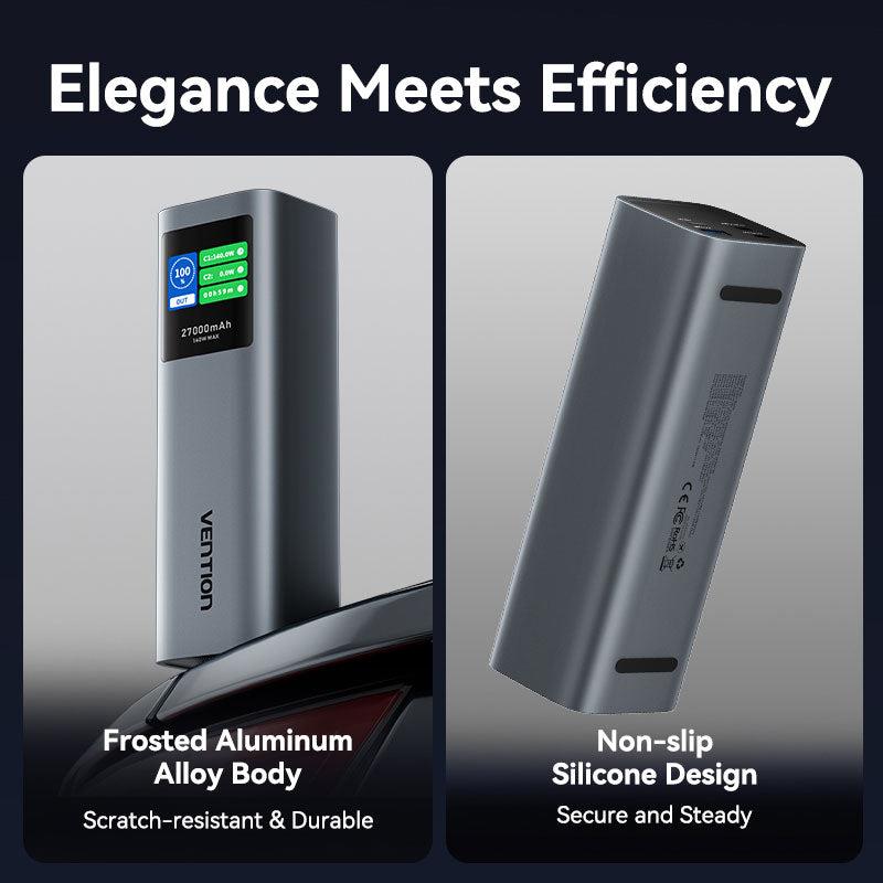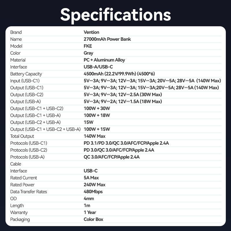 Vention 27000mAh Power Bank 140W. Battery capacity: 27000 mAh, Fast charging technology: Adaptive Fast Charging, Power Delivery 3.0, Power Delivery 3.1, Quick Charge 3.0, Battery voltage: 22.2 V. USB Type-A output ports: 1, USB Type-C ports quantity: 2. Total output power: 140 W. Product colour: Grey