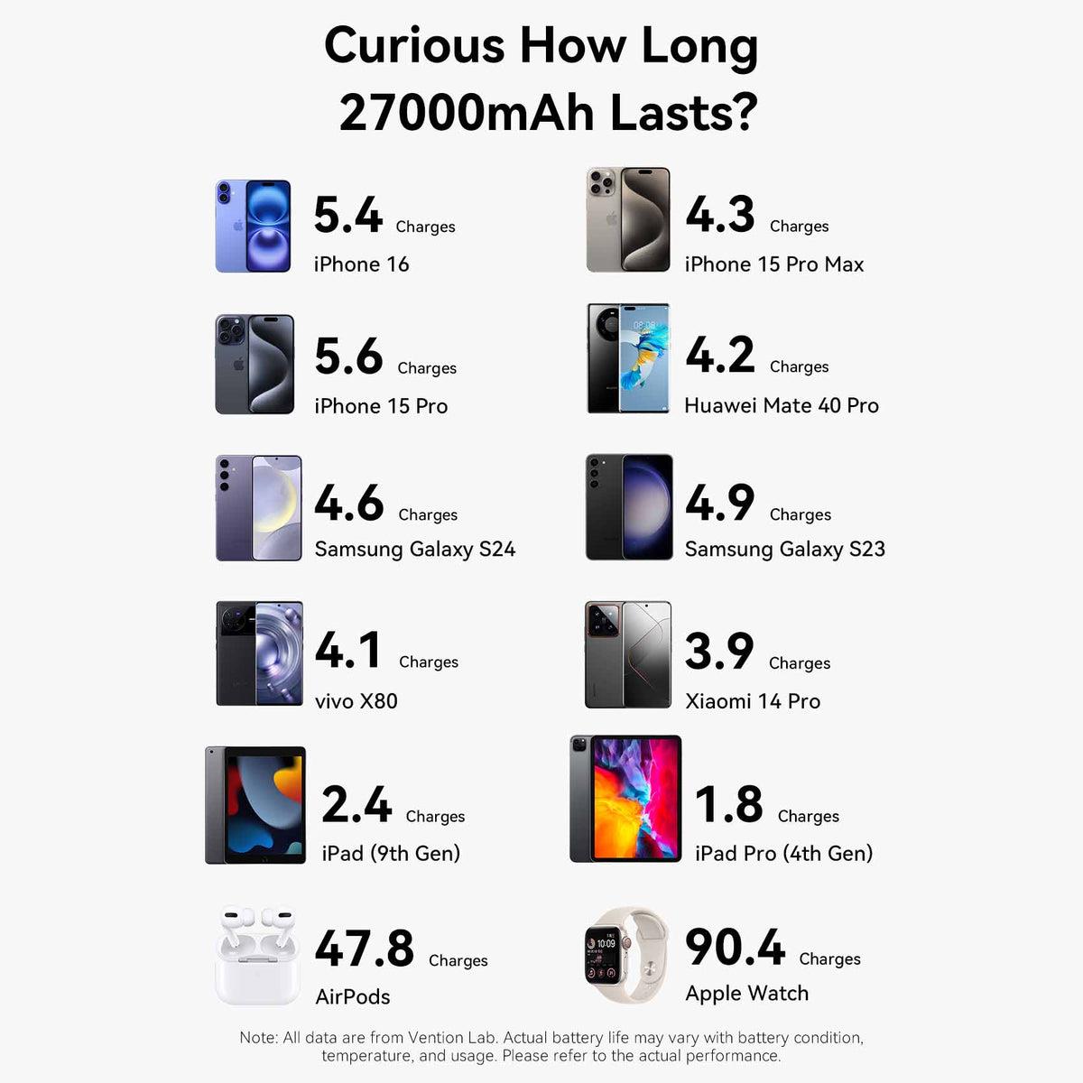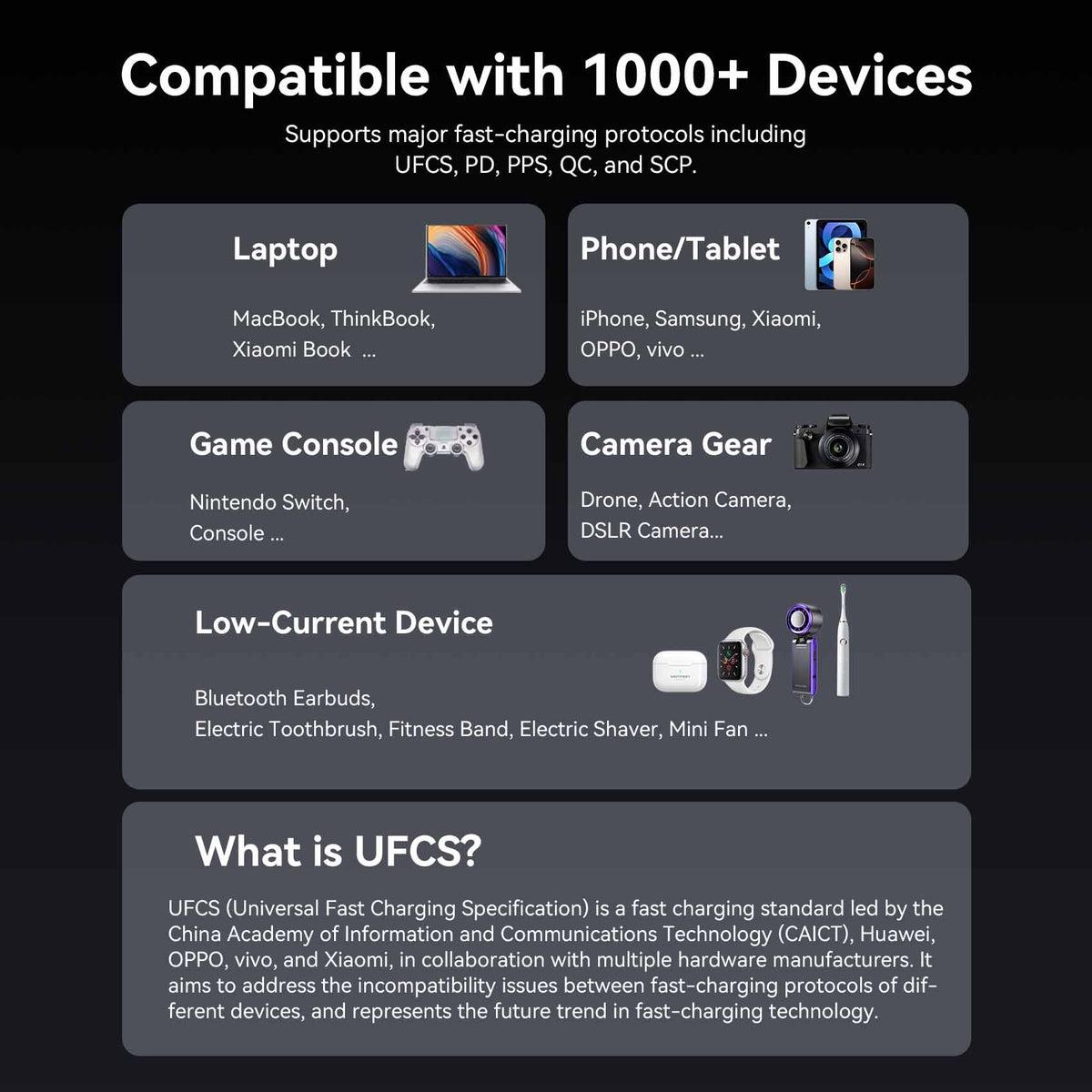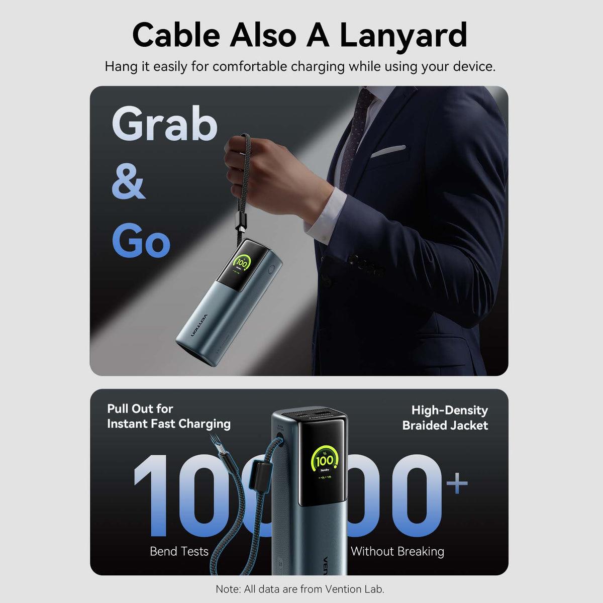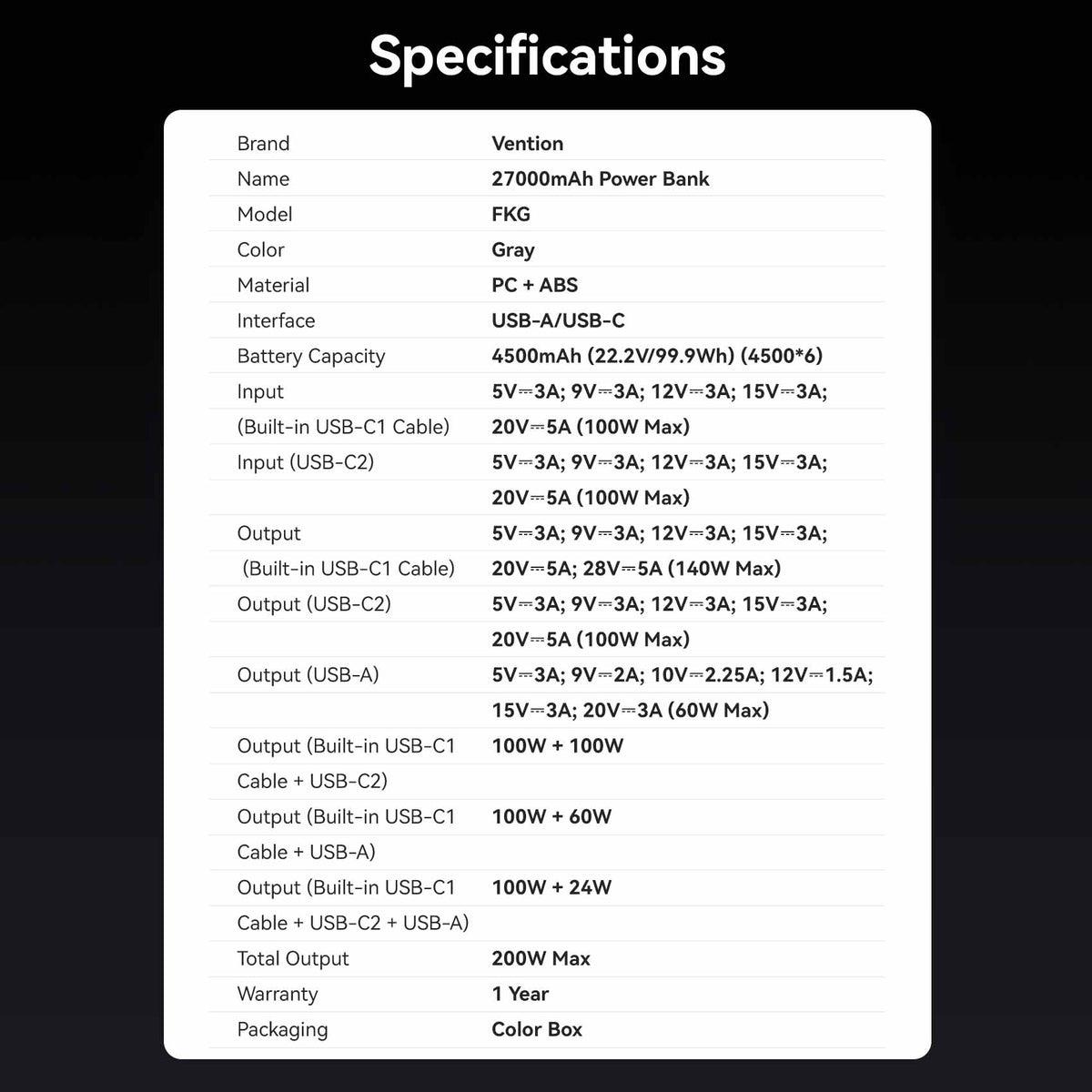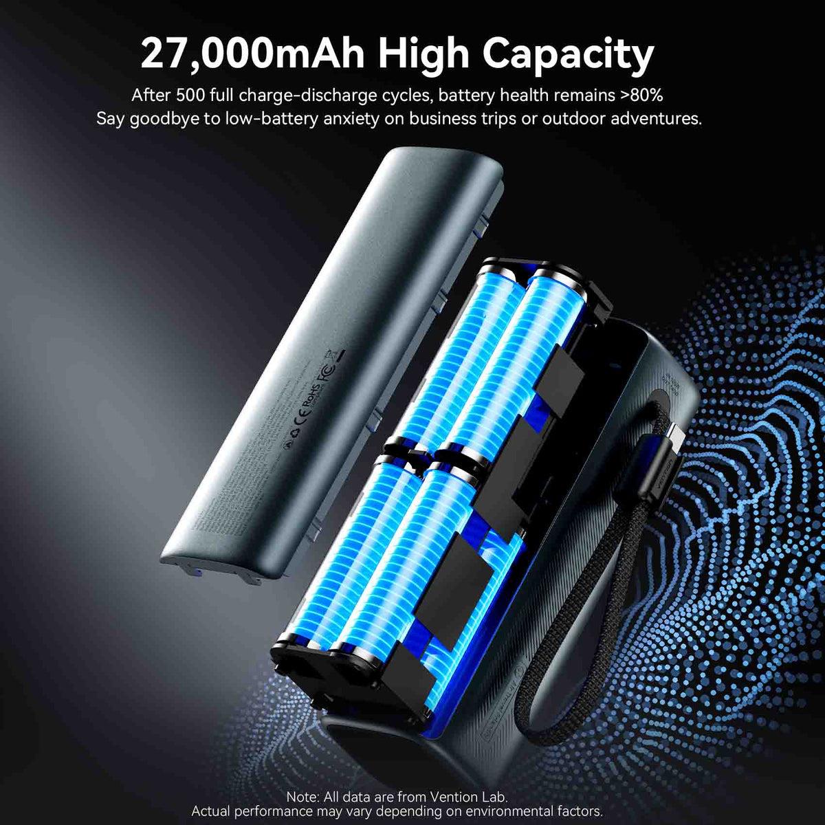 Vention 27000mAh Power Bank 200W. Battery capacity: 27000 mAh, Fast charging technology: Power Delivery 3.1, Programmable Power Supply (PPS), Battery voltage: 22.2 V. USB Type-A output ports: 1, USB Type-C ports quantity: 2. Total output power: 200 W. Product colour: Grey