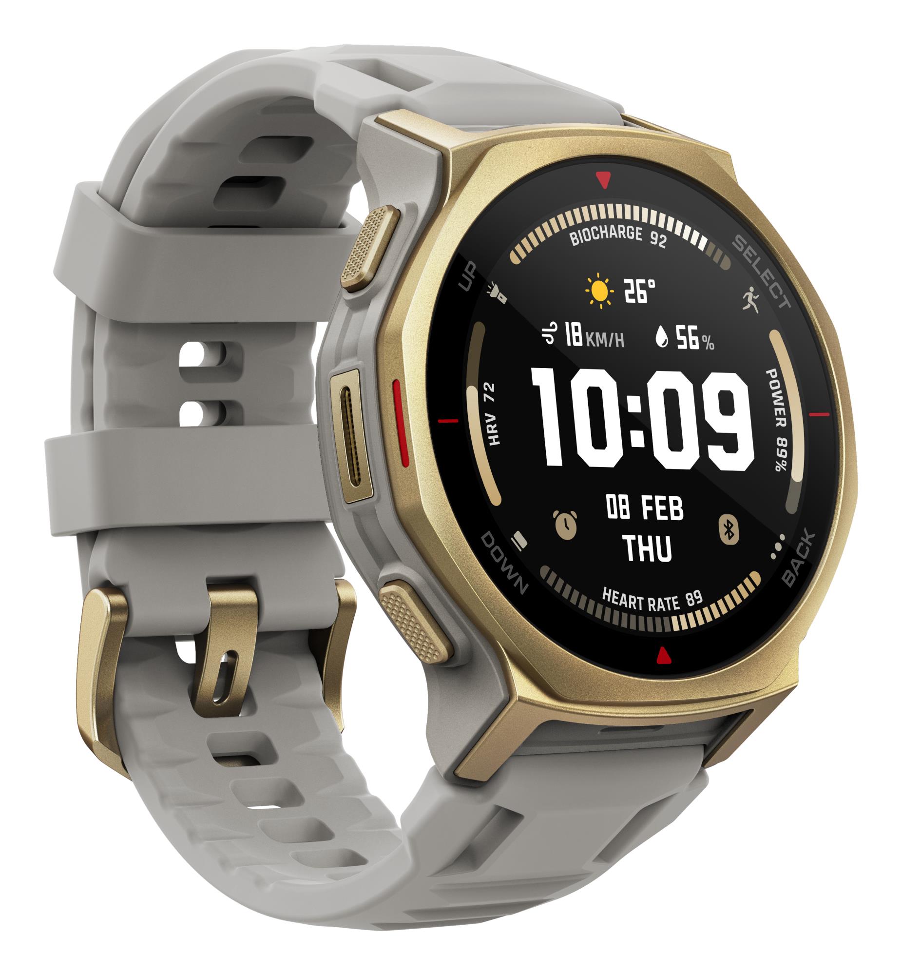Amazfit T-rex 3 Pro. Display diagonal: 3.35 cm (1.32"), Display technology: AMOLED, Display resolution: 466 x 466 pixels, Touchscreen. RAM capacity: 64 MB, Flash memory: 16 GB. Wi-Fi. GPS (satellite). Battery capacity: 640 mAh. Weight: 46.8 g. Waterproof up to: 45 m, Band material: Silicone, Band colour: Grey