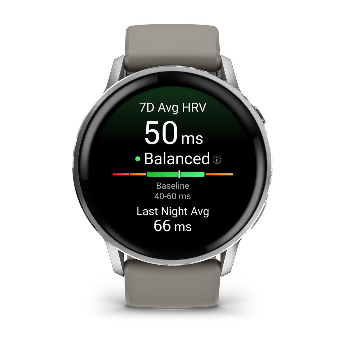 Garmin Venu 4. Display diagonal: 3.56 cm (1.4"), Display technology: AMOLED, Display resolution: 454 x 454 pixels, Touchscreen. Flash memory: 8 GB. Wi-Fi. GPS (satellite). Weight: 38 g. Band material: Silicone, Band colour: Grey, Silver