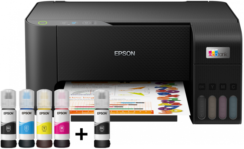 Šis „EcoTank“ spausdintuvas sutaupo iki 90 % spausdinimo išlaidų1, o dėžėje kartu pateikiamas rašalas, kurio pakaks iki 3 metų. Naudodami kartu pridedamą rašalą, išspausdinkite iki 8 100 juodos spalvos ir 6 500 spalvotų puslapių, o pakaitinis rašalo buteliukų rinkinys atitinka 66 rašalo kasetes.