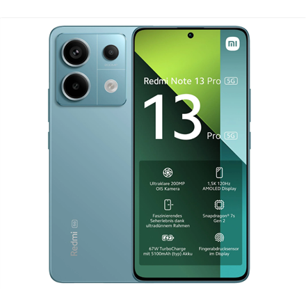 Xiaomi Redmi Note 13 Pro Ocean Teal 6.67 " AMOLED 1220 x 2712 pixels Qualcomm SM7435 Snapdragon 7s Gen 2 Internal RAM 8 GB 256 GB Dual SIM Nano-SIM 5G Main camera 200+8+2 MP Secondary camera 16 MP Android 13